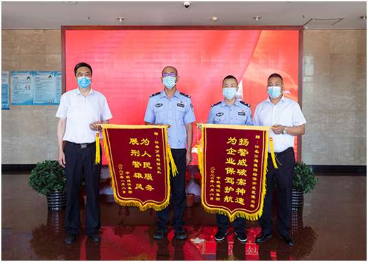 培训中心主任孔德明代表PP电子官方网站-PP电子(中国)一站式服务官方网站向怀柔分局雁栖经济开发区派出所所长和怀柔分局刑侦支队支队长送上锦旗,代表公司感谢人民警察服务企业生产建设、守护一方平安付出的艰辛努力,感谢怀柔分局雁栖开发区派出所和怀柔分局刑侦支队急企业所急、想人民所想,在企业遇到困难时及时出警,有力保障了企业财产安全,维护了社会良好秩序,为企业发展创造了平安和谐的营商环境。